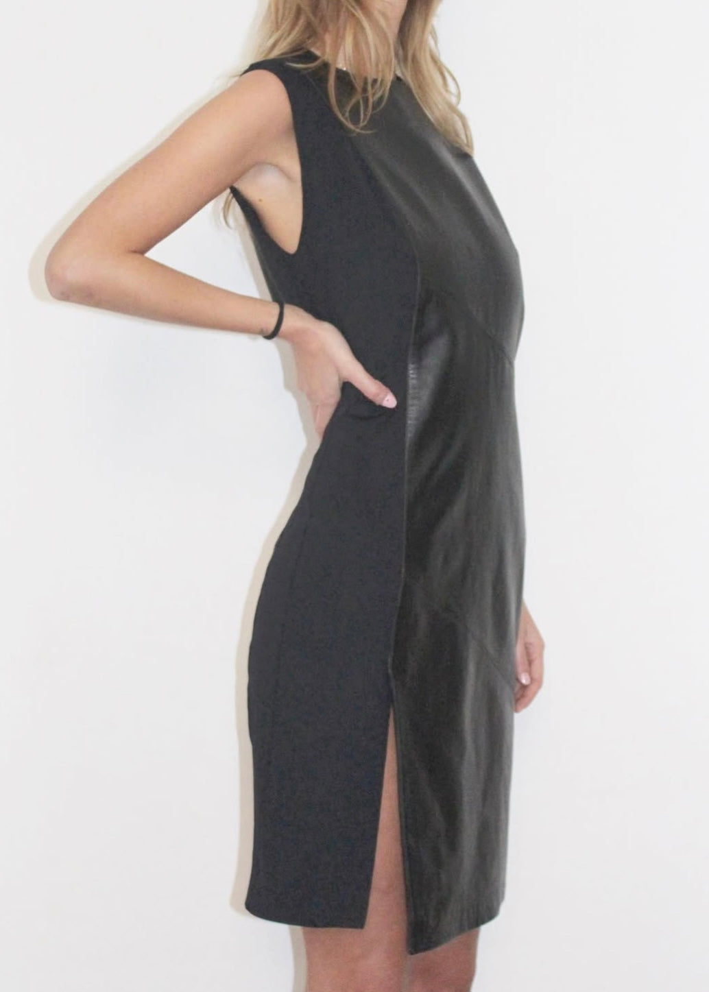 Abito midi in pelle con bordo in cotone con spacco, Versace.