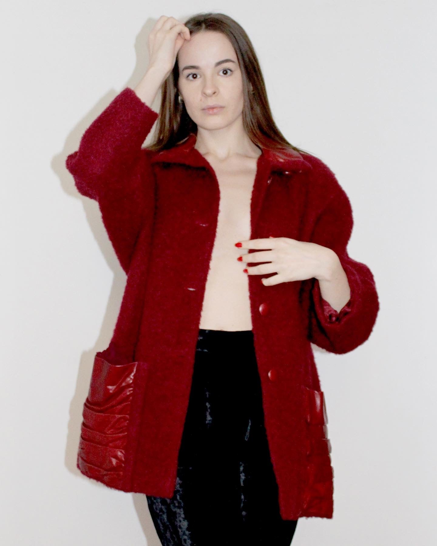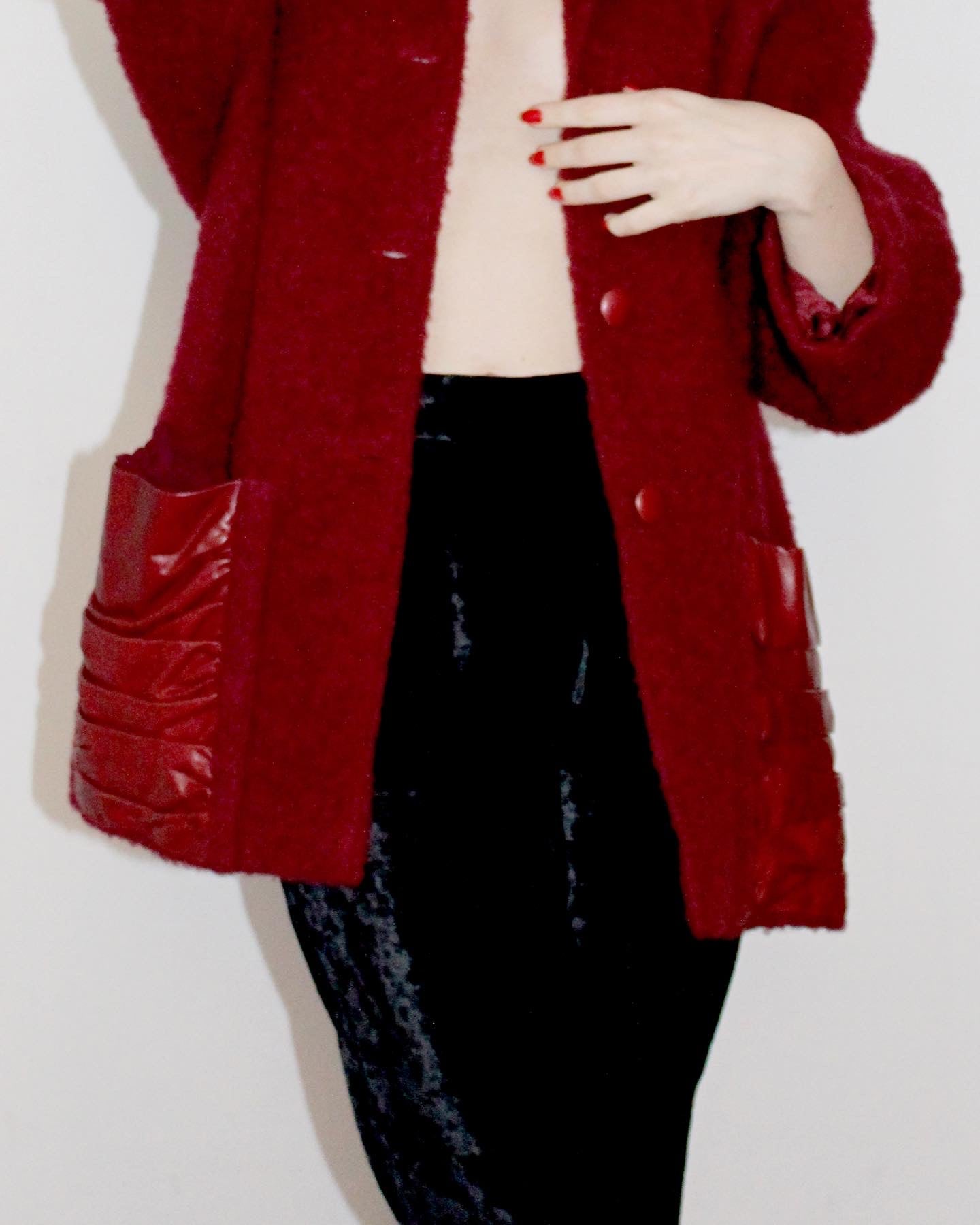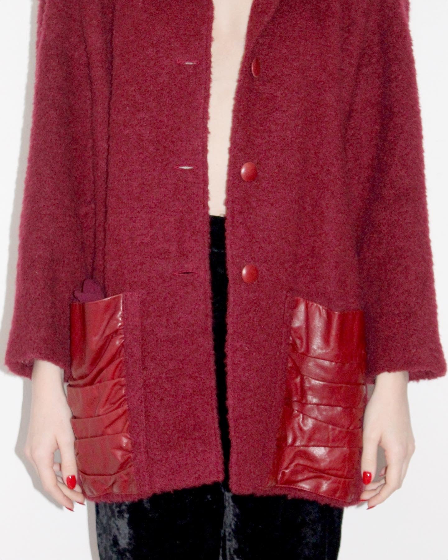 Cappotto bordeaux di lana con tasche in pelle, Cinzia Ruggeri.