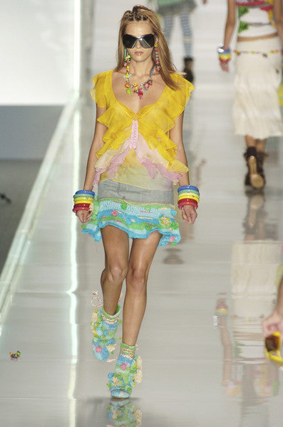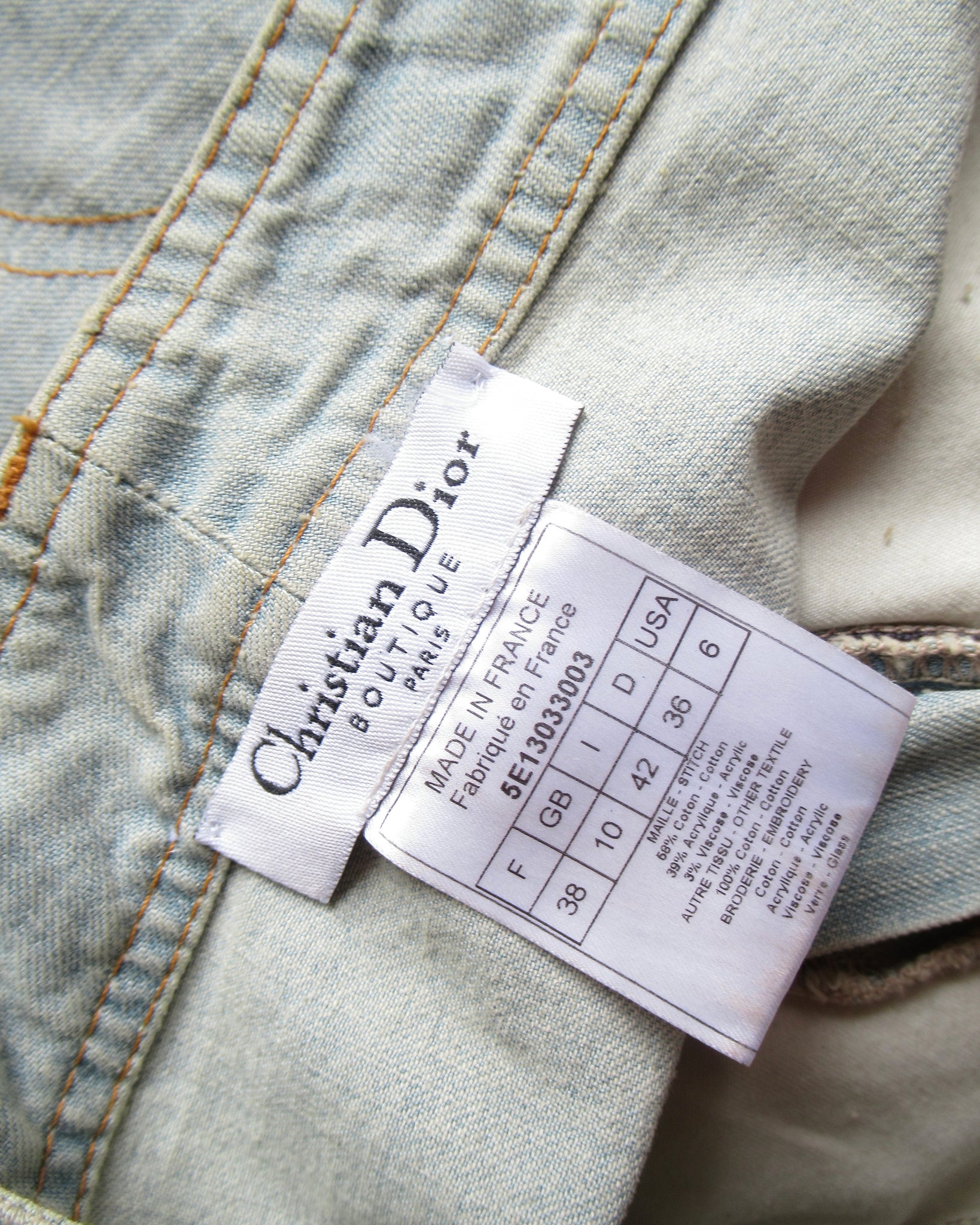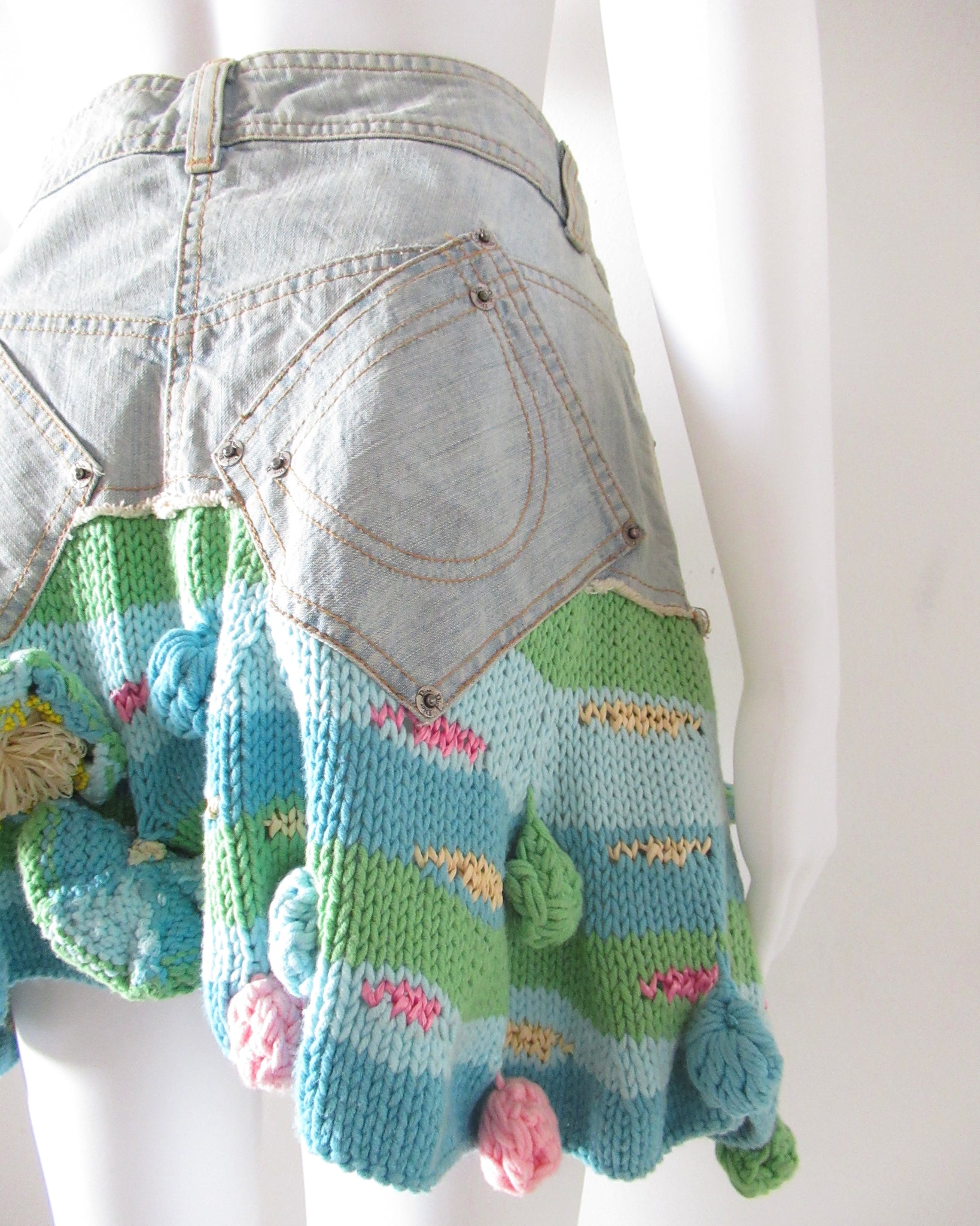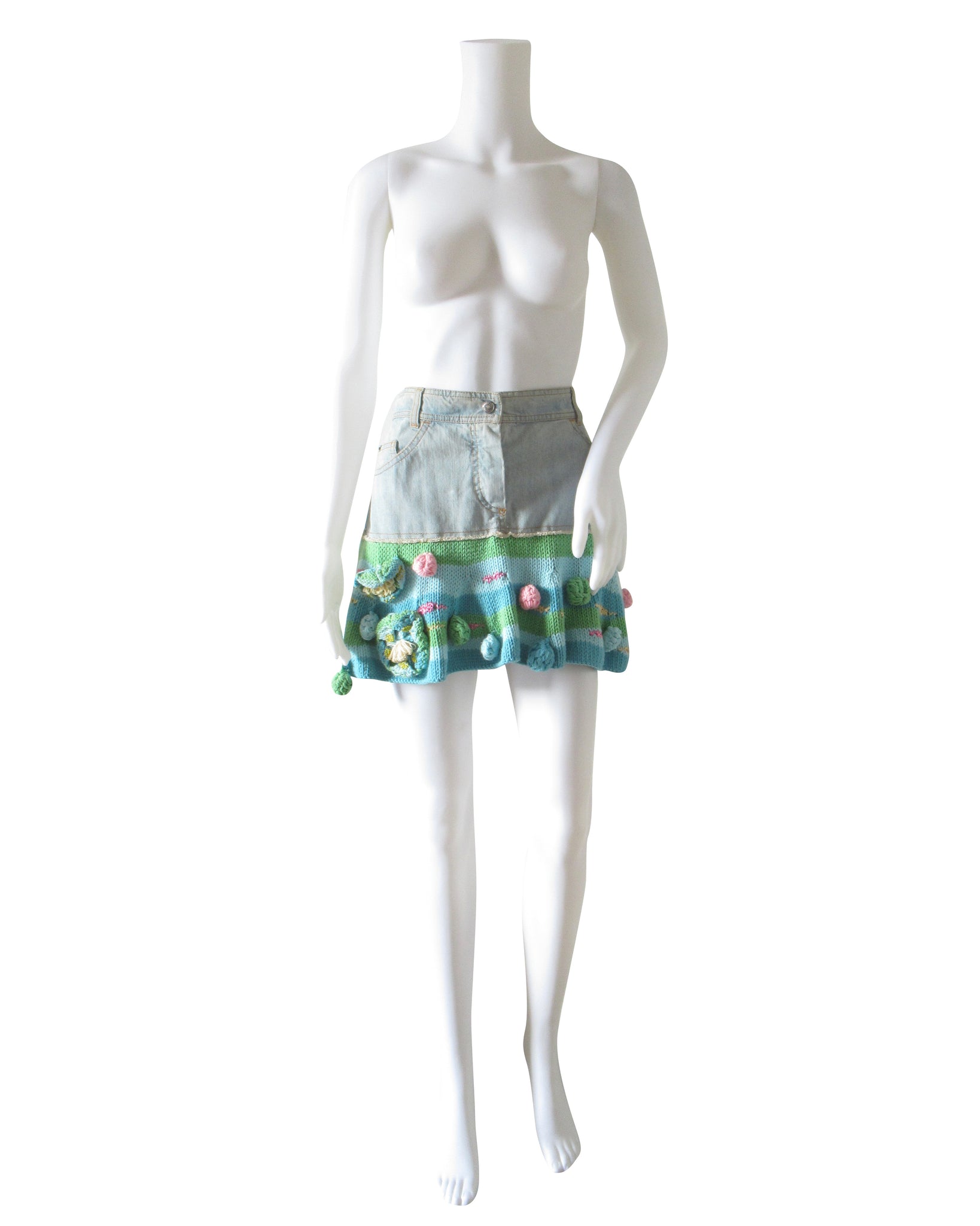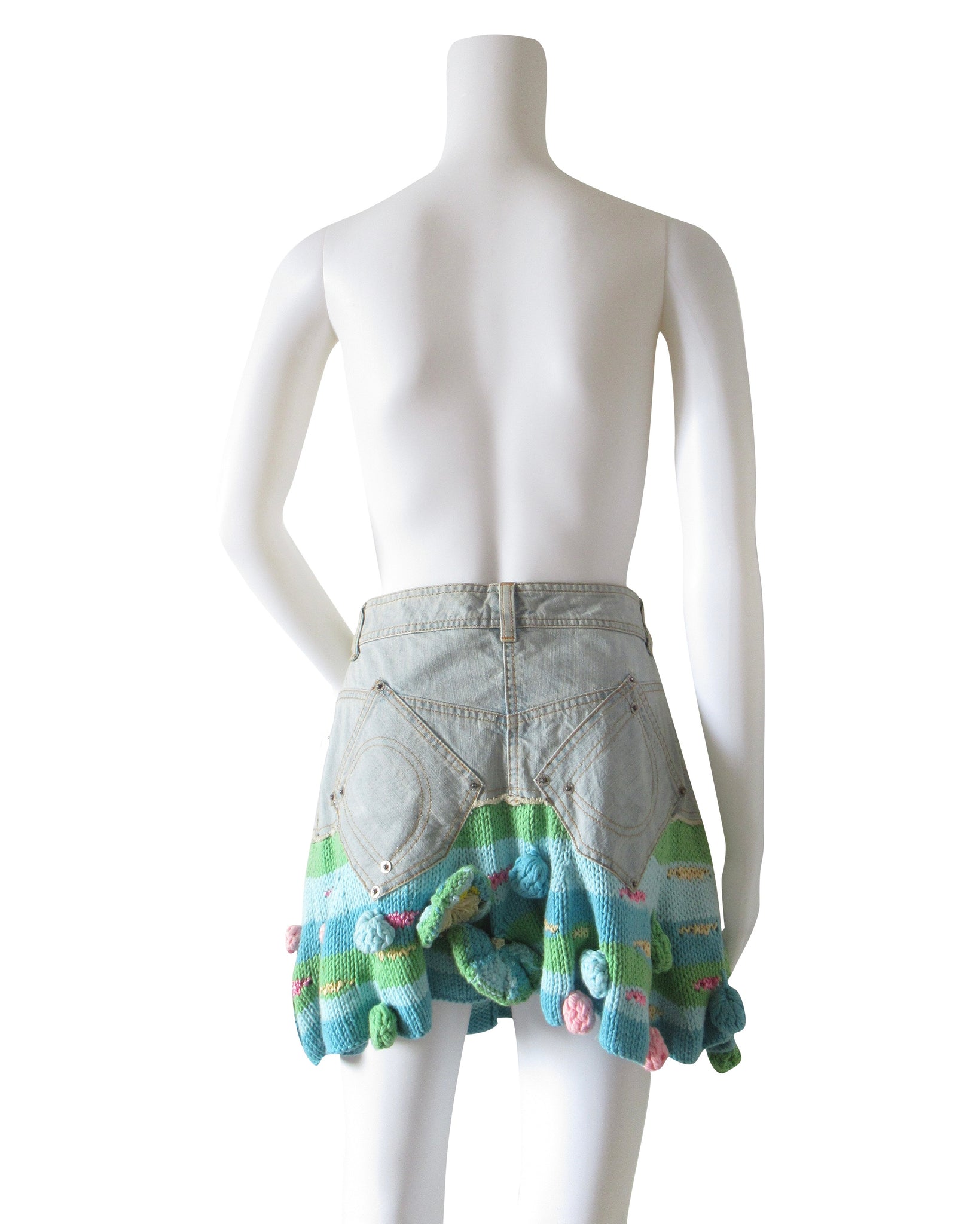 Minigonna in jeans e cotone uncinetto con applicazioni Christian Dior.