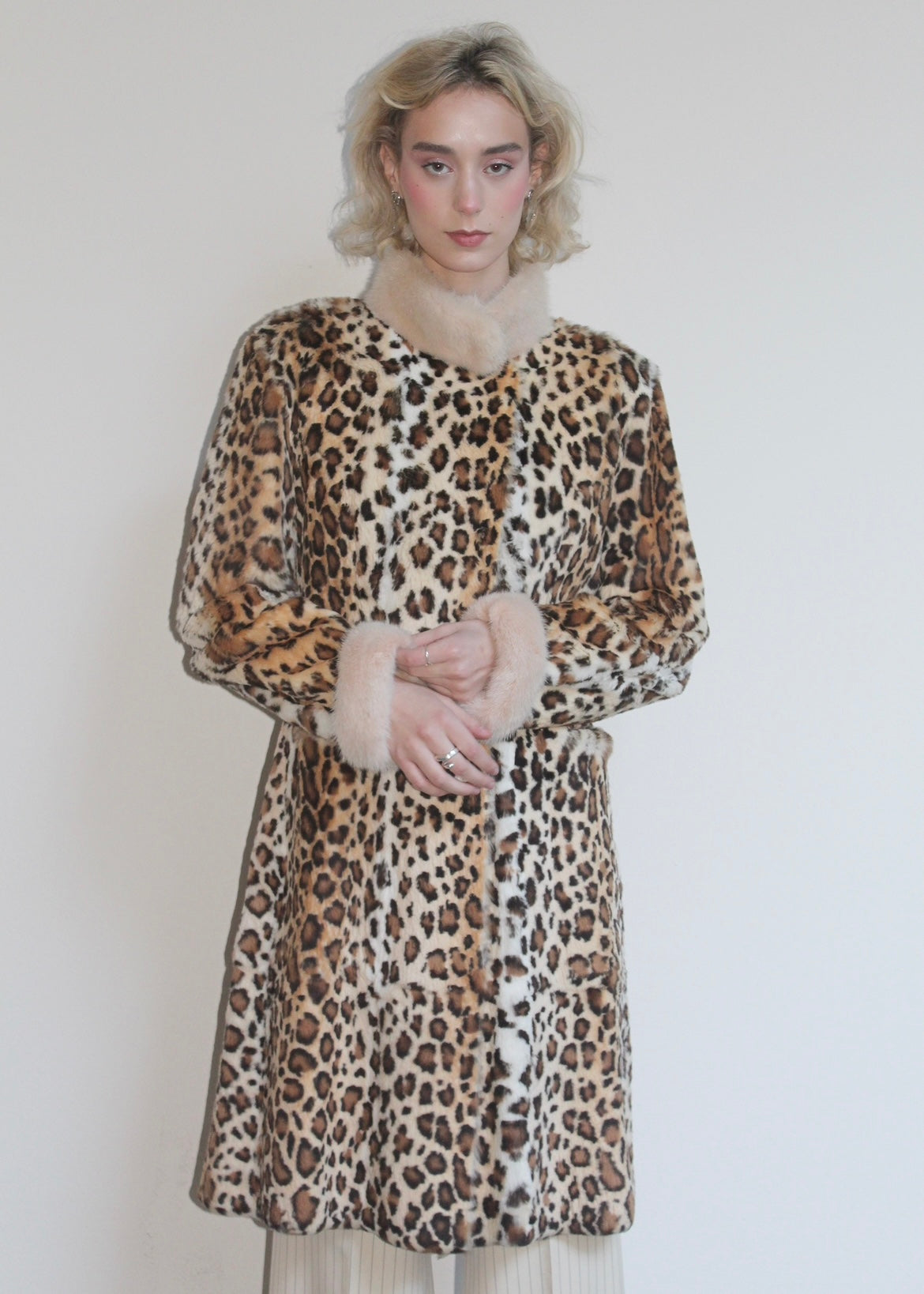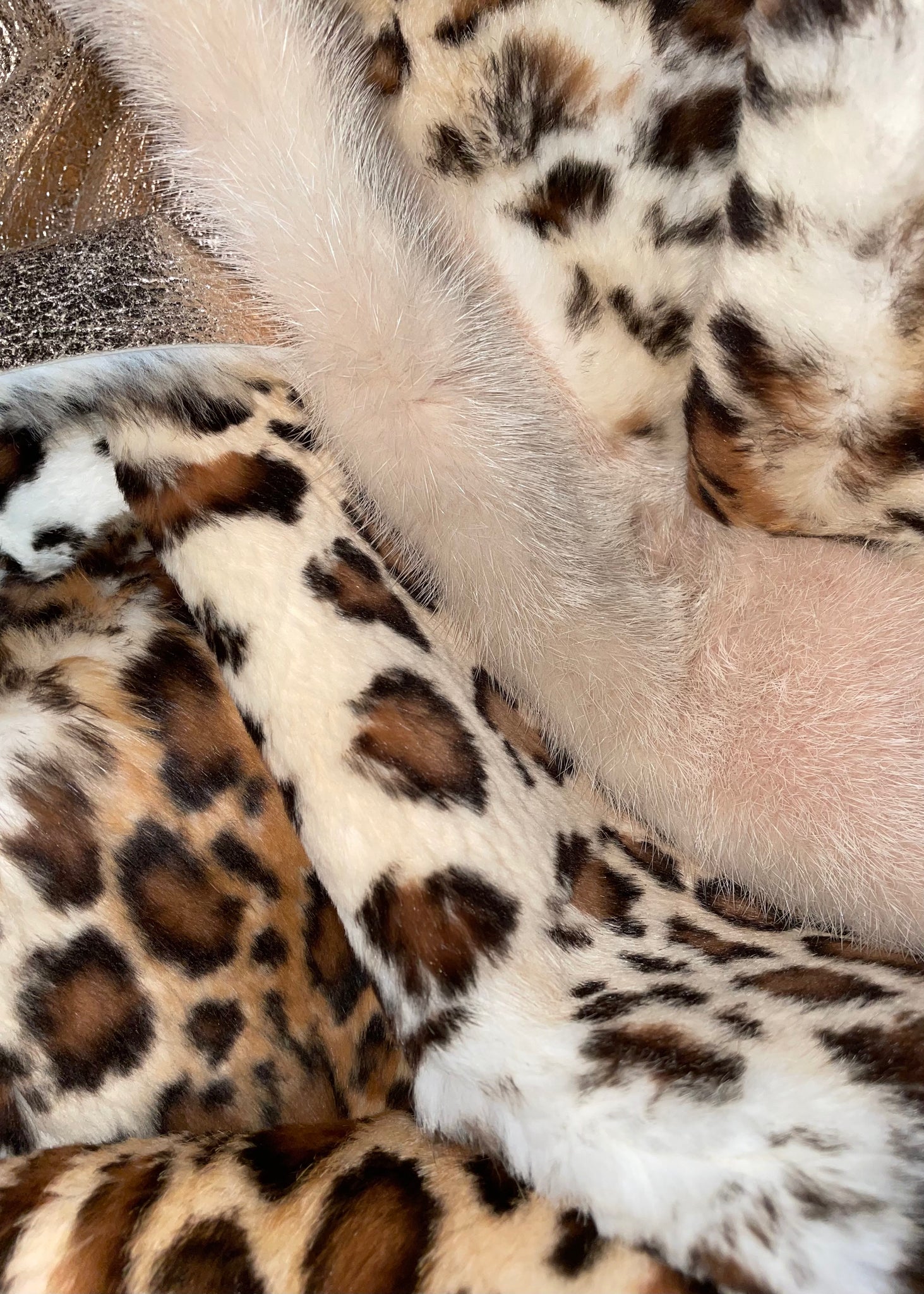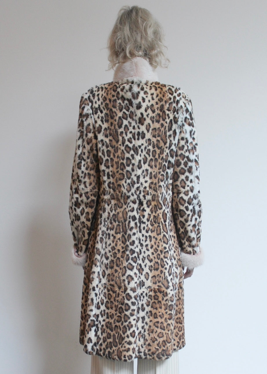 Pelliccia maculata con collo e polsini rosa, Blumarine.