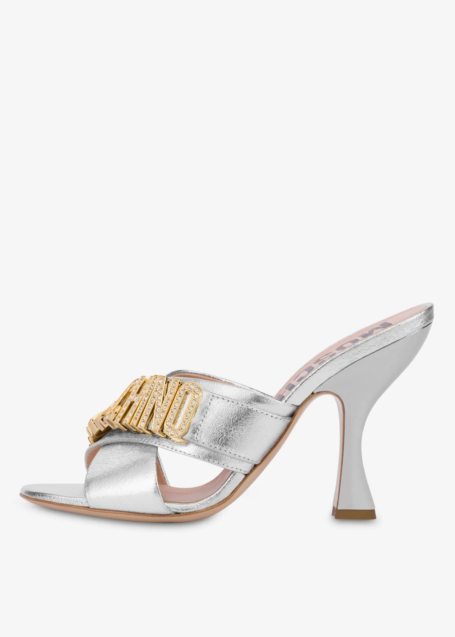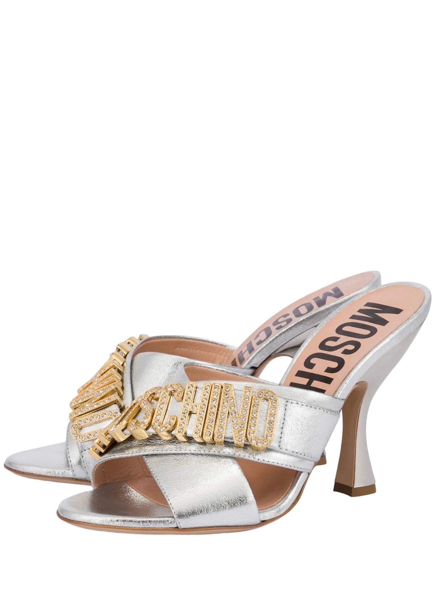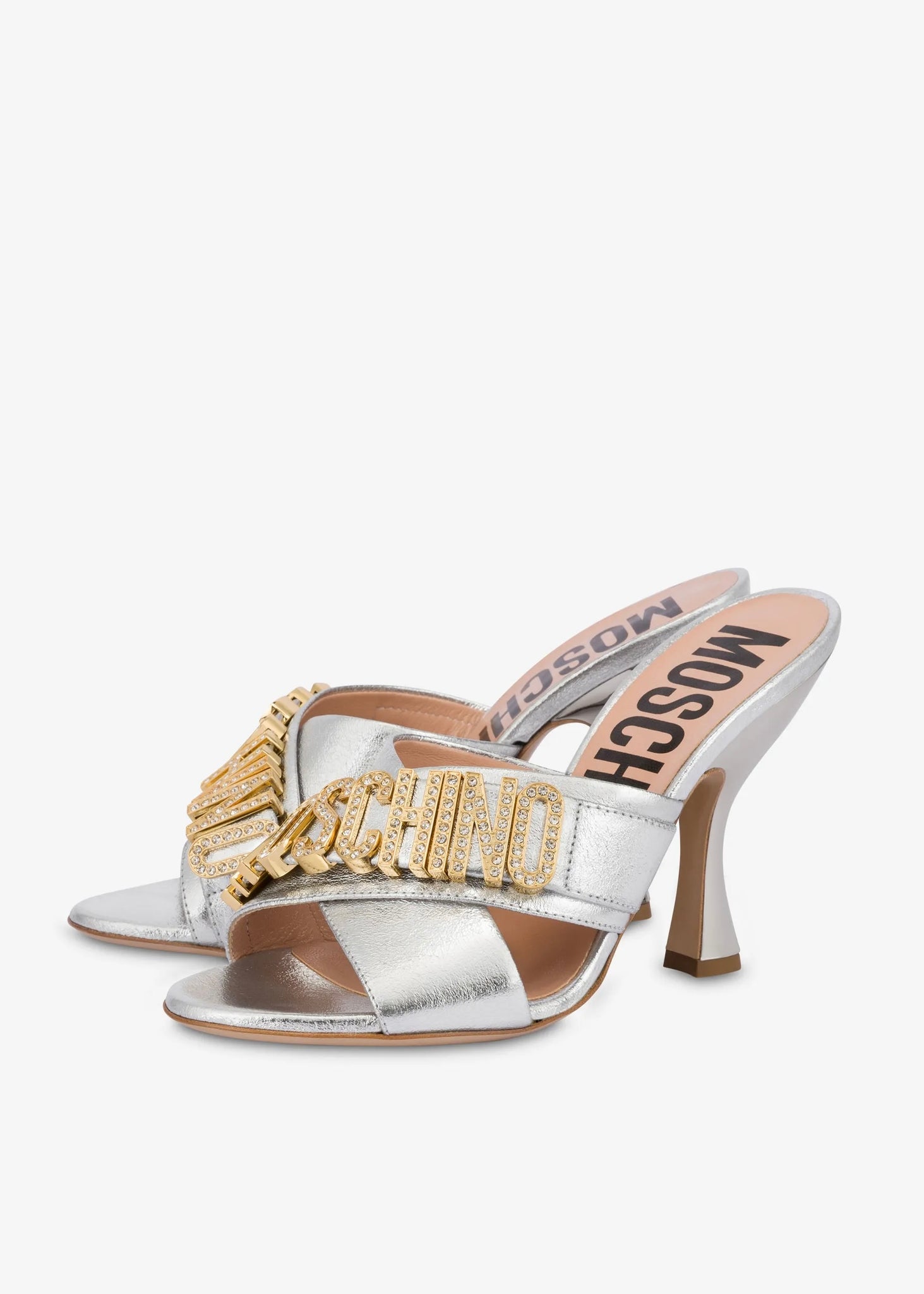 Sandali in vitello laminato con tacco a stiletto e logo lettering in galvanica oro decorato con strass, Moschino.
