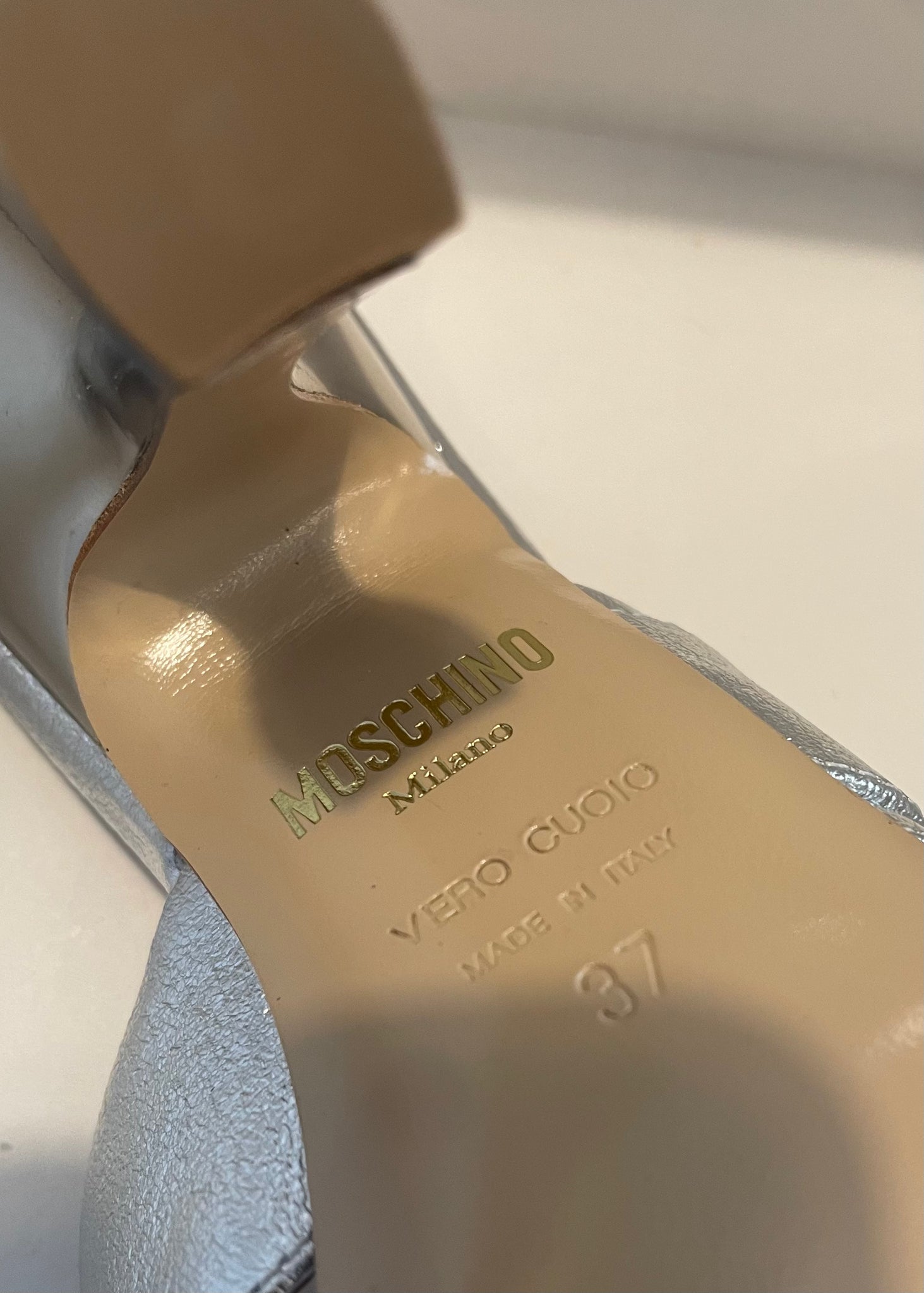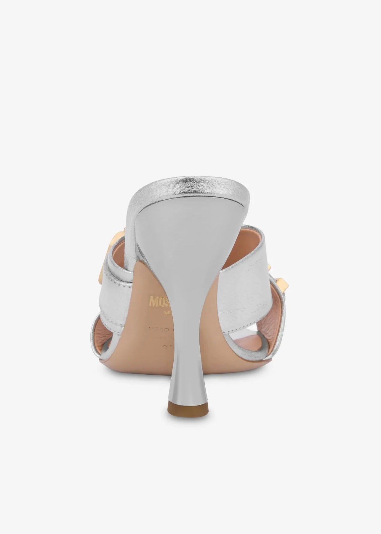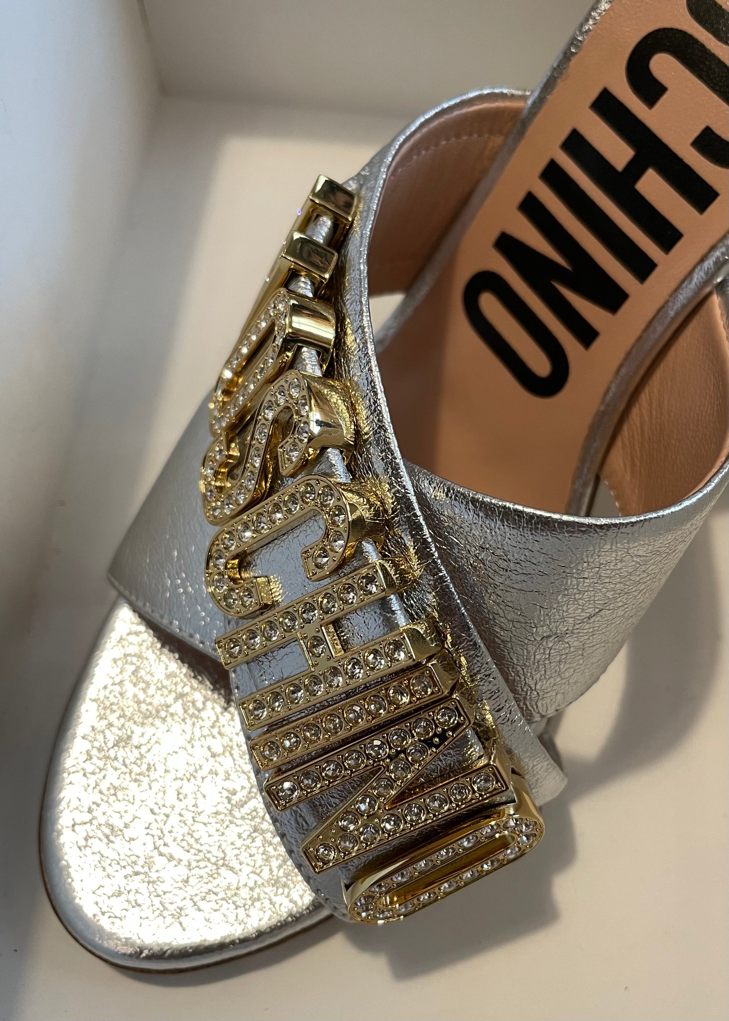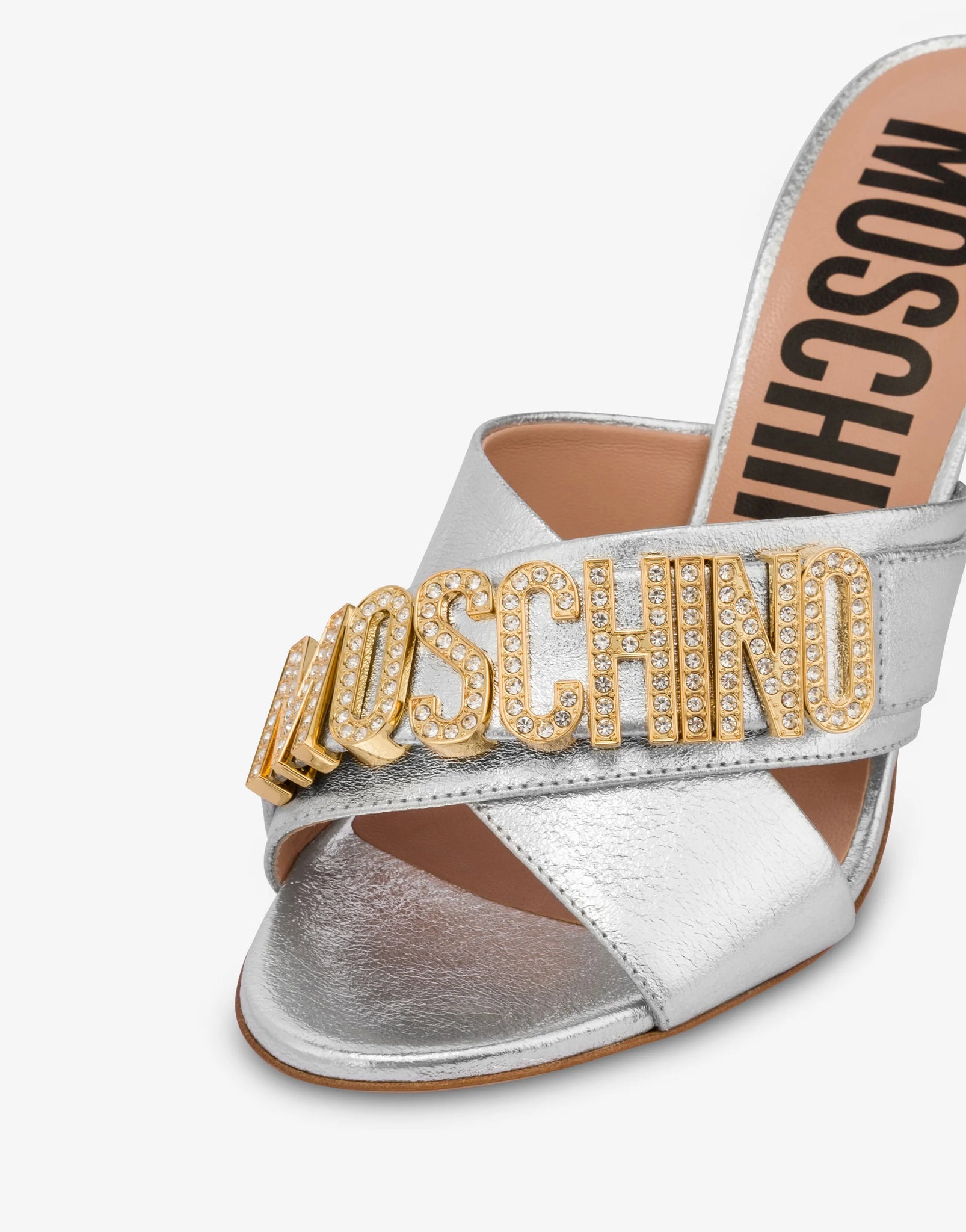 Sandali in vitello laminato con tacco a stiletto e logo lettering in galvanica oro decorato con strass, Moschino.