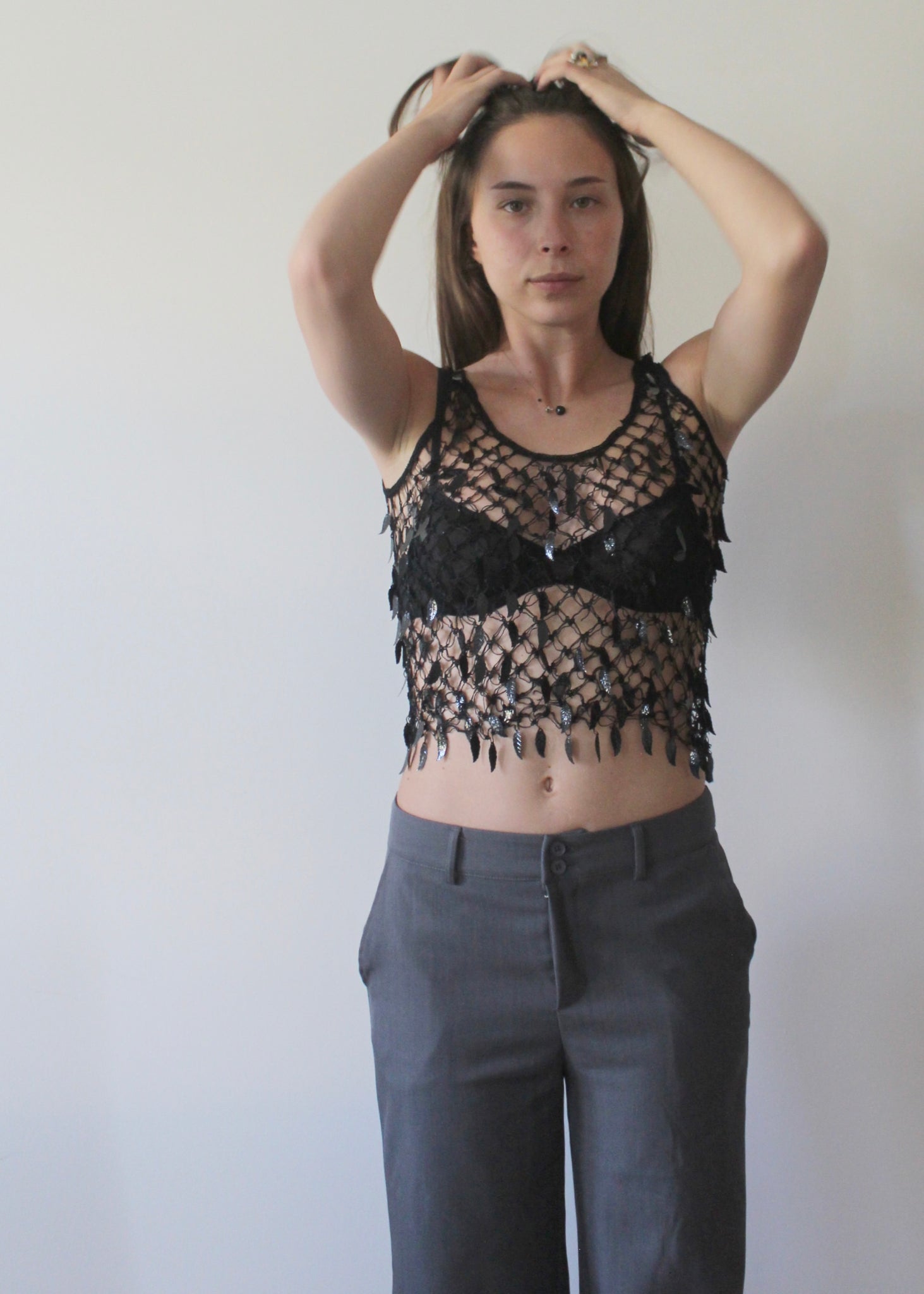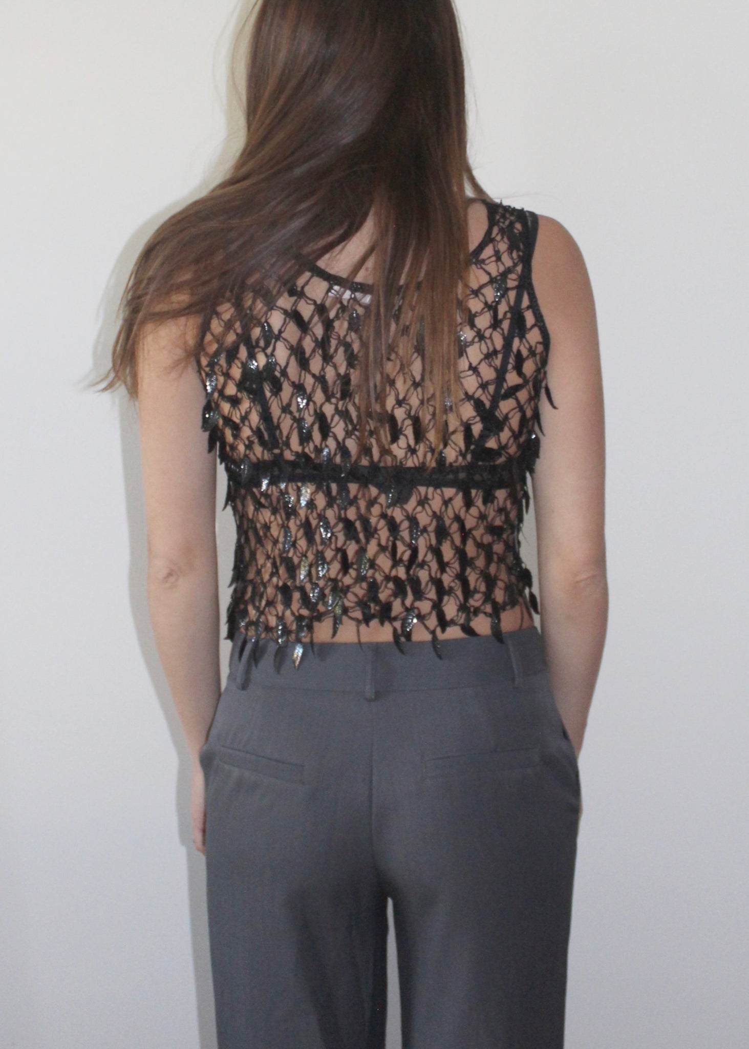 Top rete nero con applicazioni foglie in plastica, Blume Collection.
